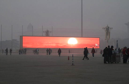そこで北京の天安門広場では巨大スクリーンを設置して、美しい日の出シーンをテレビ放送しているという。