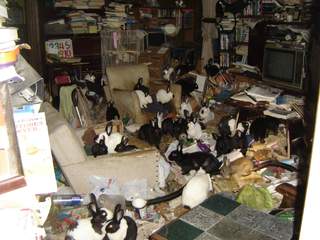 自宅に何十から何百匹もの犬や猫を飼育するが、飼い主はお世話を放棄して不衛生な環境や劣悪な栄養状態によりペットを死に追いやる動物虐待である。