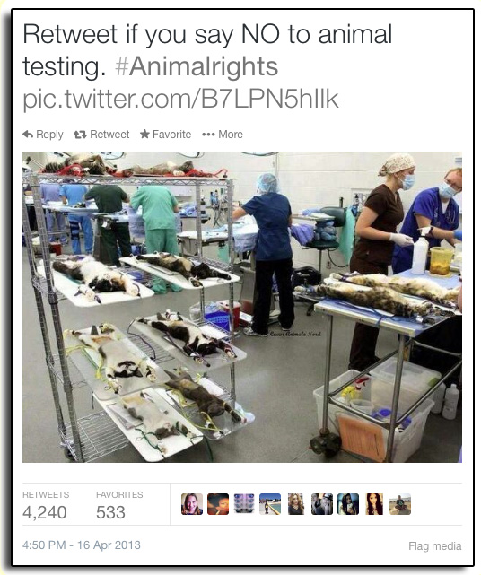 ”動物実験にNoと言うならTwitterでこの画像を拡散しましょう”という触れ込みで、世界中でこの画像が出回った。