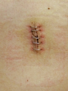 背中を見ると大きな傷口があり、それが雑に縫われていた。尋常ではない痛みで思うように動けないので、救急車を呼ぶことにした。